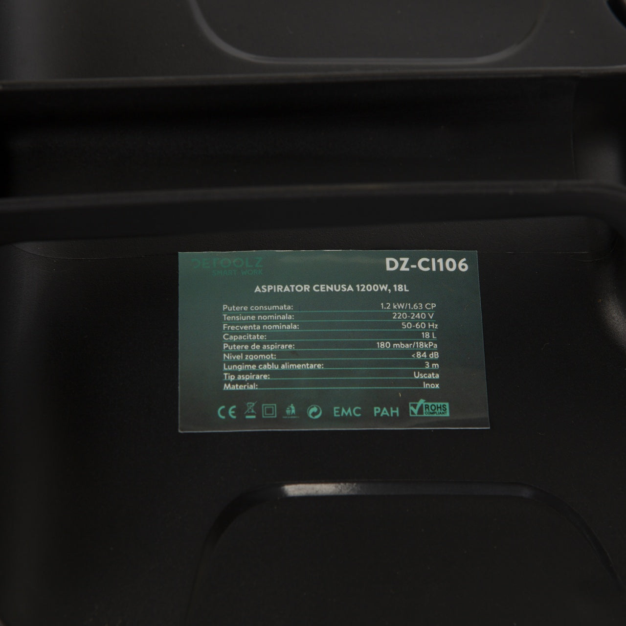 Aspiratorul de cenusa 1200W, 18 litri, Detoolz DZ-CI106 are urmatoarele caracteristici: