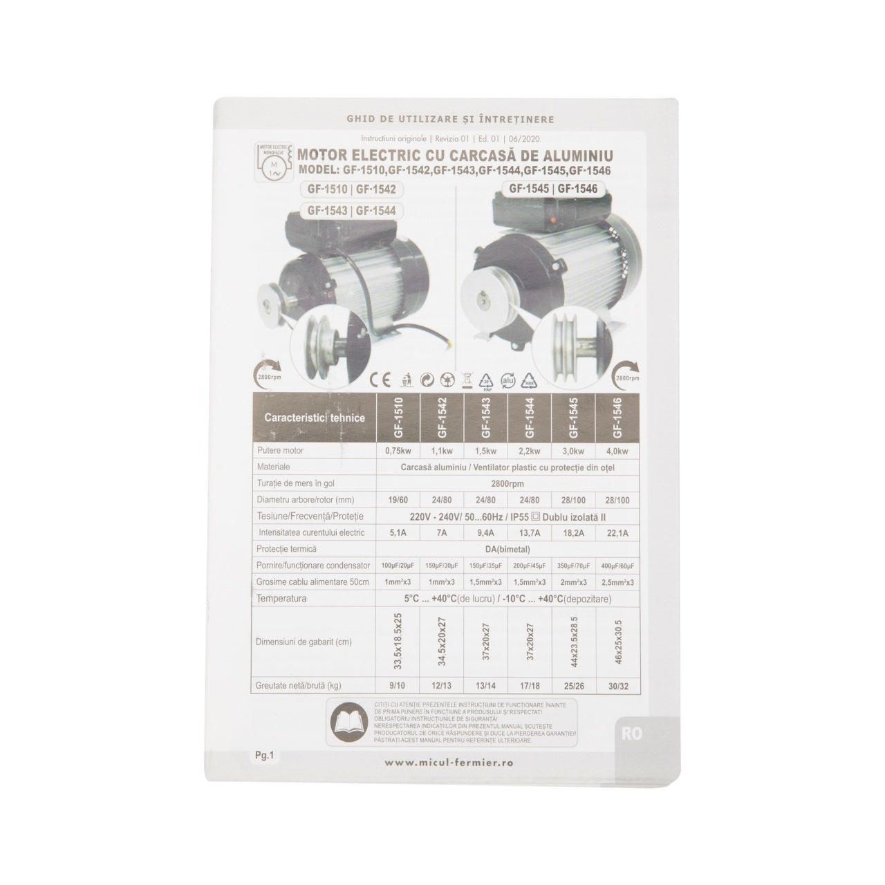 Motor electric 2800RPM, 2.2KW, cu carcasa de aluminiu, Micul Fermier GF-1544 nu este folosit niciodata singur. Un motor electric trebuie integrat intr-un sistem care necesita energie mecanica. Directia de rotatie standard pentru motoare electrice monofazice este in contra-sensul acelor de ceasornic.
