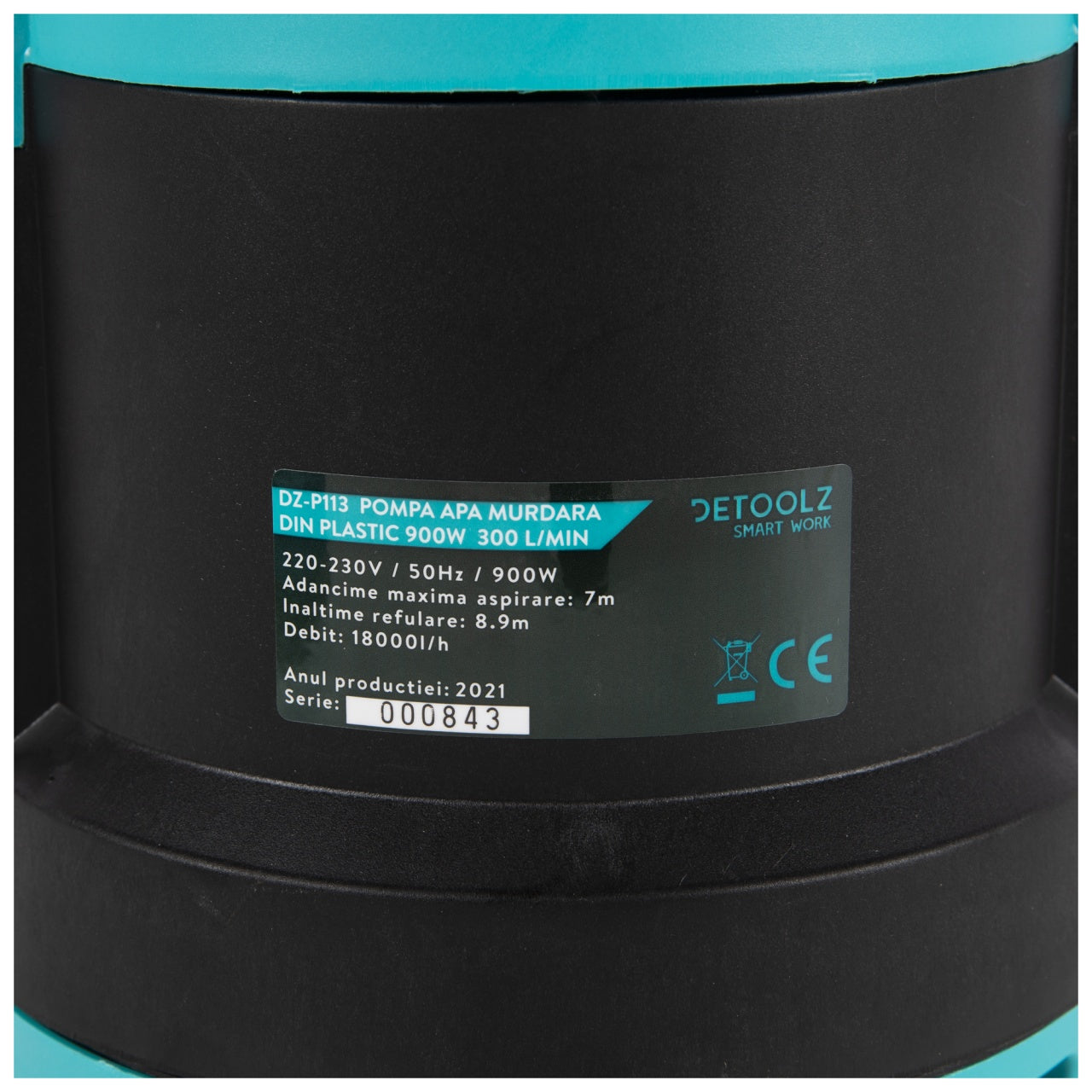 Pompa apa murdara din plastic 900W 300l/min, Detoolz DZP113 are urmatoarele caracteristici: