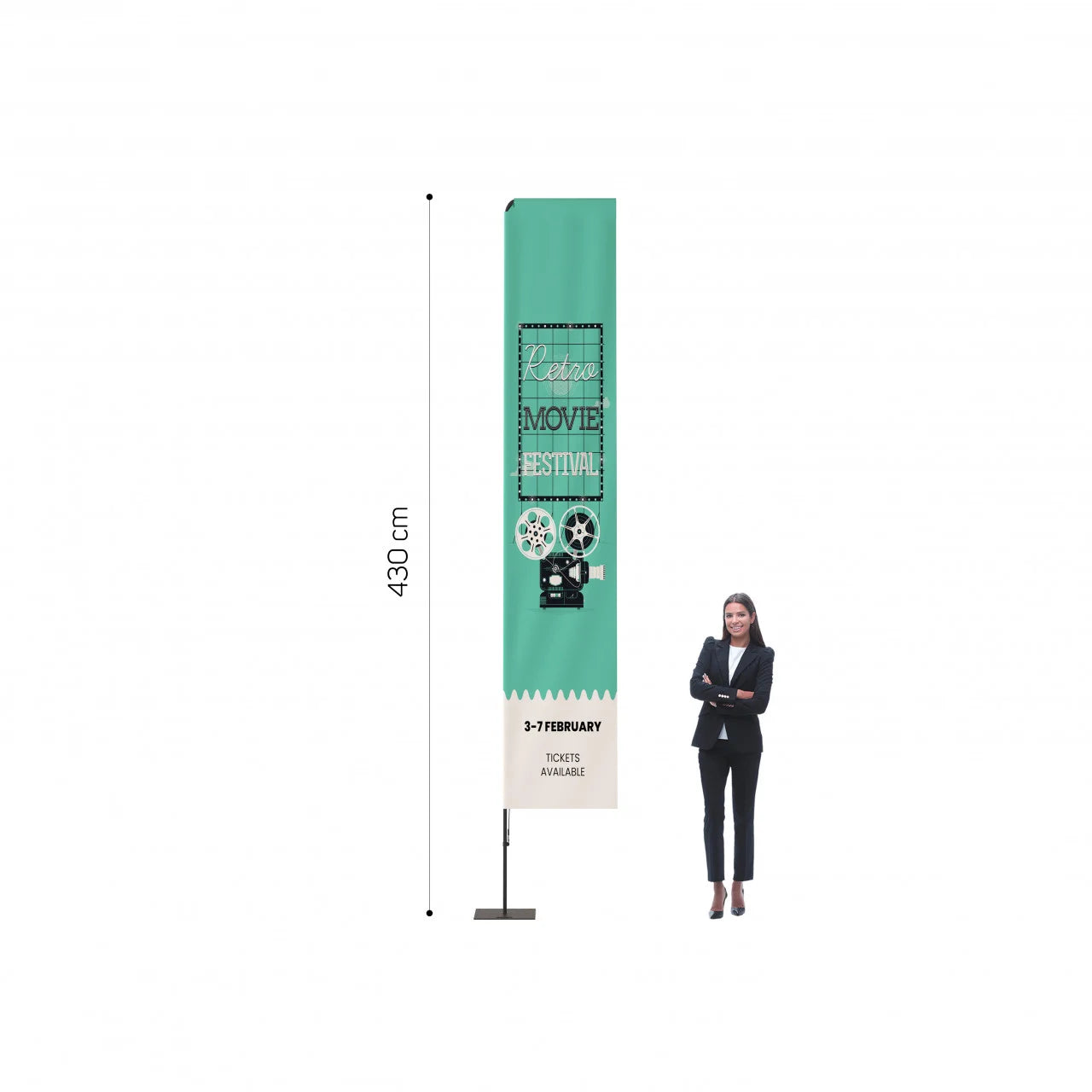 Sistem expozitional publicitar outdoor, ideal pentru evenimente sportive, targuri agro, festivaluri, baruri, restaurante, dealeri auto. Structura realizata din aluminiu si materialul textil imprimat ofera o rezistenta indelungata. Sistemul este portabil, se monteza rapid si simplu, special fabricat pentru o depozitare facila. Combinat cu una din bazele de sustinere disponibile, steagul poate fi amplasat pe diferite suprafete.