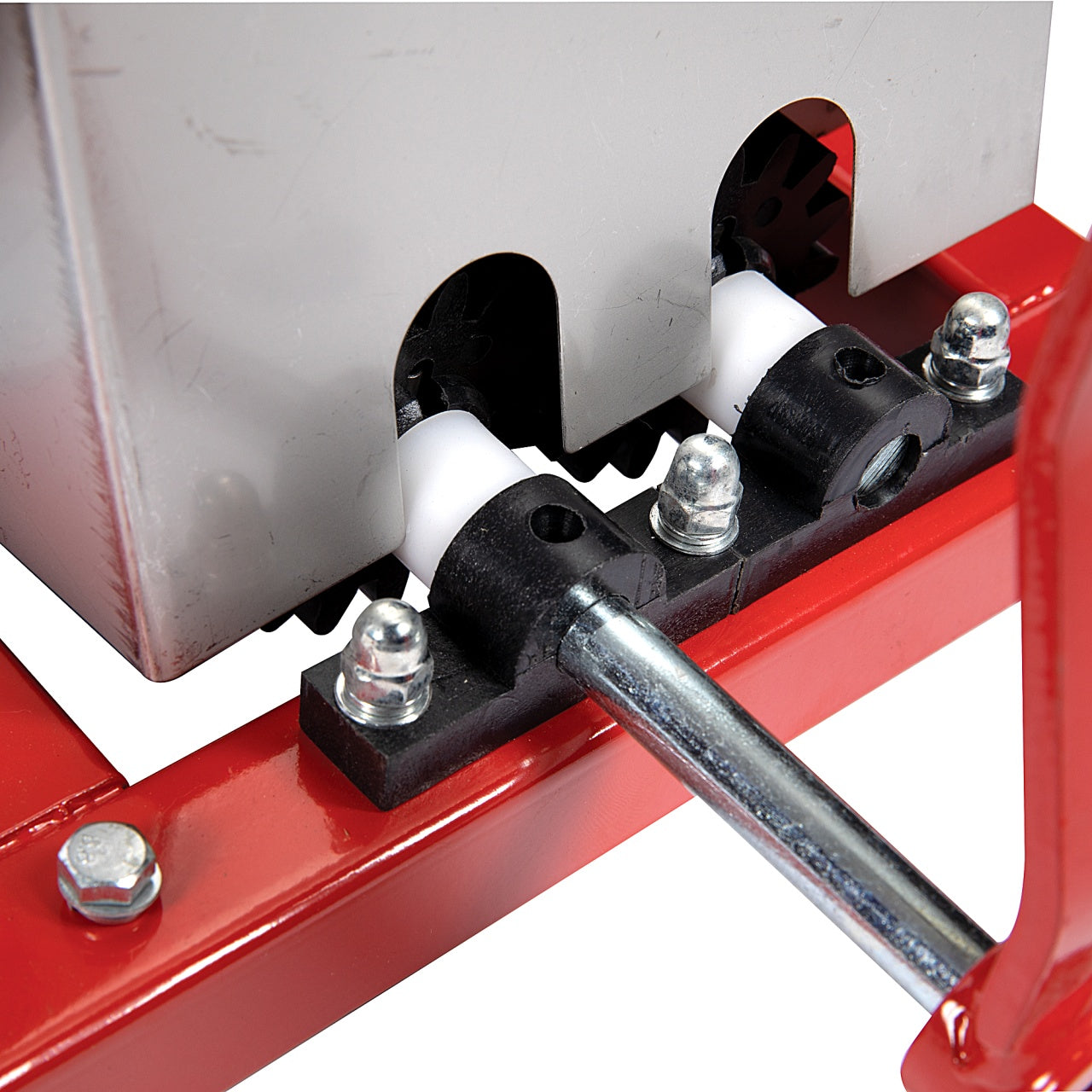 Manerul deosebit de mare si ergonomic va permite sa operati zdrobitorul de fructe cu un efort minim in timpul prelucrarii. Picioarele sunt acoperite cu plastic pentru a proteja suprafata de lucru si pentru a asigura stabilitatea concasorului(zdrobitorului). Datorita functionarii manuale, zdrobitorul de fructe este, de asemenea, ideal ori de cate ori electricitatea este greu accesibila sau nu este deloc disponibila. Constructia robusta din fier, aluminiu si otel inoxidabil garanteaza multi ani de utilizare.